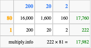 Finally, we add up all the sums we found in step 3 to get our final answer to 222 times 81.