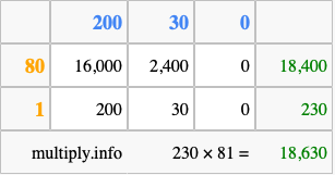 Finally, we add up all the sums we found in step 3 to get our final answer to 230 times 81.