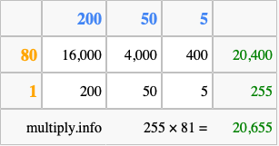 That's all there is to it! As you can see from the box above, the answer to 255 times 81 using the box method is 20,655.