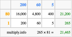 Finally, we add up all the sums we found in step 3 to get our final answer to 265 times 81.