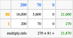 That's all there is to it! As you can see from the box above, the answer to 270 times 81 using the box method is 21,870.