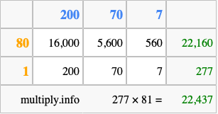 That's all there is to it! As you can see from the box above, the answer to 277 times 81 using the box method is 22,437.