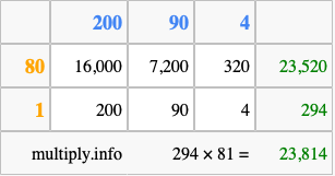 Finally, we add up all the sums we found in step 3 to get our final answer to 294 times 81.