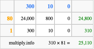 Below is an illustration showing you how to calculate 310 times 81 using the box method, using the instructions above.