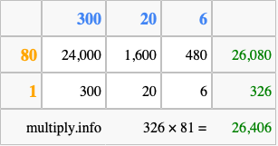 Finally, we add up all the sums we found in step 3 to get our final answer to 326 times 81.