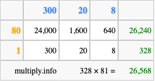 Below is an illustration showing you how to calculate 328 times 81 using the box method, using the instructions above.