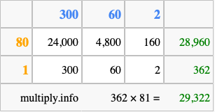 That's all there is to it! As you can see from the box above, the answer to 362 times 81 using the box method is 29,322.