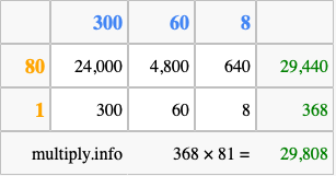 Finally, we add up all the sums we found in step 3 to get our final answer to 368 times 81.