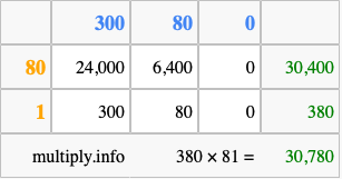 Below is an illustration showing you how to calculate 380 times 81 using the box method, using the instructions above.