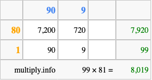 Finally, we add up all the sums we found in step 3 to get our final answer to 99 times 81.