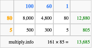 Below is an illustration showing you how to calculate 161 times 85 using the box method, using the instructions above.