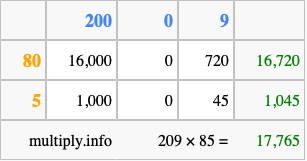 Finally, we add up all the sums we found in step 3 to get our final answer to 209 times 85.