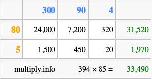 Finally, we add up all the sums we found in step 3 to get our final answer to 394 times 85.