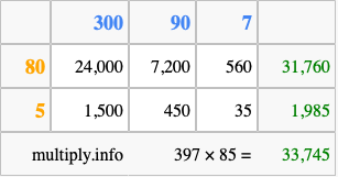 Finally, we add up all the sums we found in step 3 to get our final answer to 397 times 85.