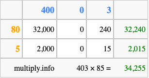 Finally, we add up all the sums we found in step 3 to get our final answer to 403 times 85.