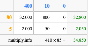 Finally, we add up all the sums we found in step 3 to get our final answer to 410 times 85.