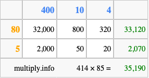 Finally, we add up all the sums we found in step 3 to get our final answer to 414 times 85.