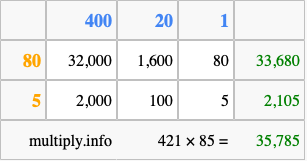 Finally, we add up all the sums we found in step 3 to get our final answer to 421 times 85.