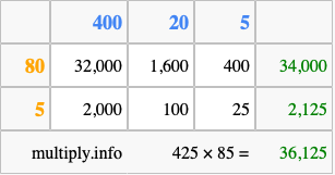 Finally, we add up all the sums we found in step 3 to get our final answer to 425 times 85.