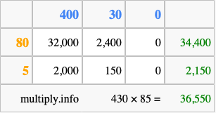 Finally, we add up all the sums we found in step 3 to get our final answer to 430 times 85.