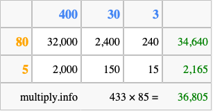 That's all there is to it! As you can see from the box above, the answer to 433 times 85 using the box method is 36,805.