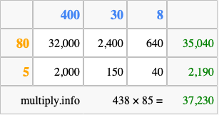 Finally, we add up all the sums we found in step 3 to get our final answer to 438 times 85.