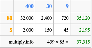 Finally, we add up all the sums we found in step 3 to get our final answer to 439 times 85.