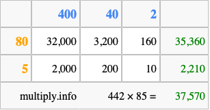 Finally, we add up all the sums we found in step 3 to get our final answer to 442 times 85.