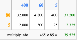 Finally, we add up all the sums we found in step 3 to get our final answer to 465 times 85.