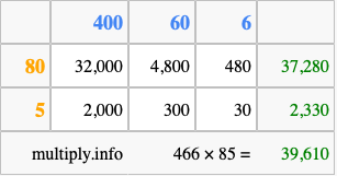 Finally, we add up all the sums we found in step 3 to get our final answer to 466 times 85.