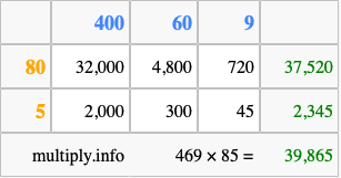 Finally, we add up all the sums we found in step 3 to get our final answer to 469 times 85.