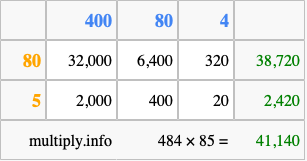 Finally, we add up all the sums we found in step 3 to get our final answer to 484 times 85.