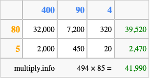 Finally, we add up all the sums we found in step 3 to get our final answer to 494 times 85.