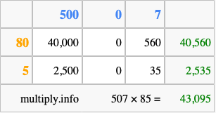 Below is an illustration showing you how to calculate 507 times 85 using the box method, using the instructions above.