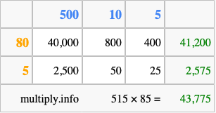 That's all there is to it! As you can see from the box above, the answer to 515 times 85 using the box method is 43,775.