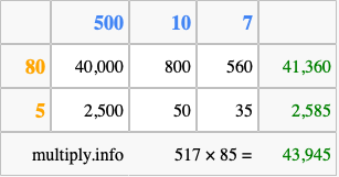 Finally, we add up all the sums we found in step 3 to get our final answer to 517 times 85.