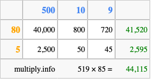 Below is an illustration showing you how to calculate 519 times 85 using the box method, using the instructions above.
