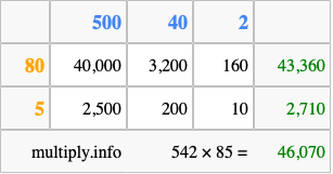 That's all there is to it! As you can see from the box above, the answer to 542 times 85 using the box method is 46,070.