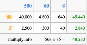 That's all there is to it! As you can see from the box above, the answer to 568 times 85 using the box method is 48,280.