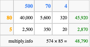 Finally, we add up all the sums we found in step 3 to get our final answer to 574 times 85.