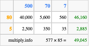 Finally, we add up all the sums we found in step 3 to get our final answer to 577 times 85.