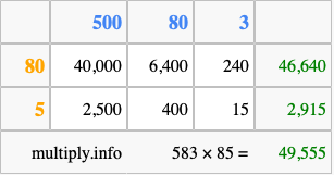 Finally, we add up all the sums we found in step 3 to get our final answer to 583 times 85.
