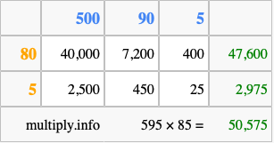 Finally, we add up all the sums we found in step 3 to get our final answer to 595 times 85.