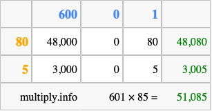 Finally, we add up all the sums we found in step 3 to get our final answer to 601 times 85.