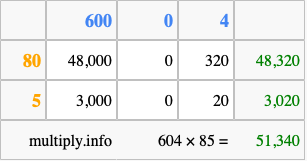 Finally, we add up all the sums we found in step 3 to get our final answer to 604 times 85.