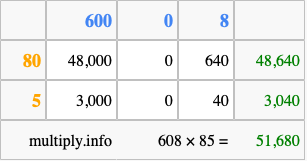 Finally, we add up all the sums we found in step 3 to get our final answer to 608 times 85.