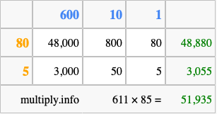 Finally, we add up all the sums we found in step 3 to get our final answer to 611 times 85.