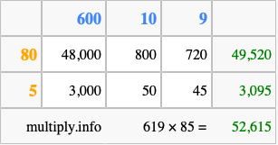 Finally, we add up all the sums we found in step 3 to get our final answer to 619 times 85.