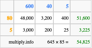 Finally, we add up all the sums we found in step 3 to get our final answer to 645 times 85.