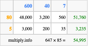 Finally, we add up all the sums we found in step 3 to get our final answer to 647 times 85.